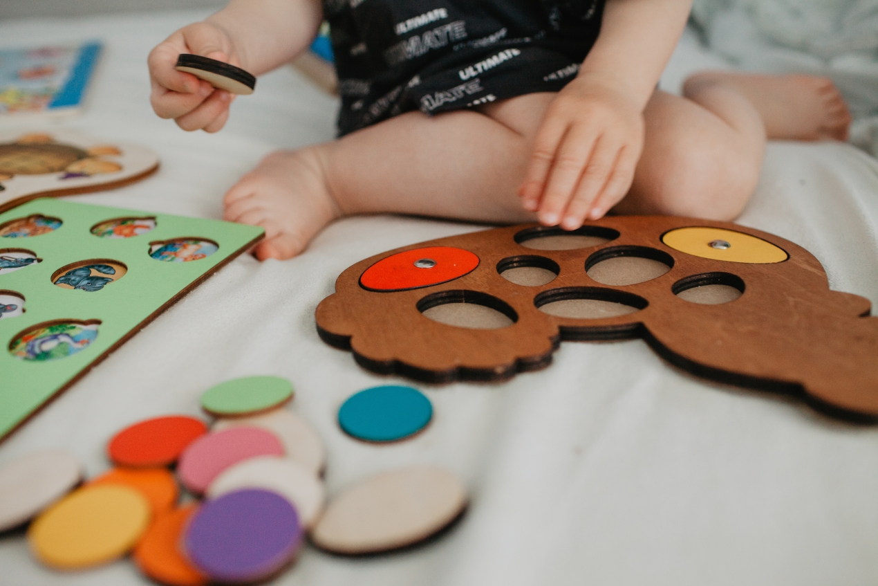 - Układanki z dużymi, kolorowymi elementami – wspierają rozwój motoryki małej i percepcji wzrokowej,